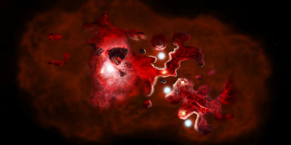 This artist’s impression illustrates masses of star-forming galaxies in the early universe, featuring dark dust marked in red and carbon gases depicted in black. These details have been extensively documented across multiple galaxies in Alma’s Cristal Survey. Image credits: NSF/AUI/NRAO/B. SAXTON.