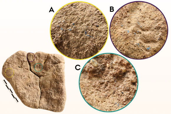 Three areas of blue residues found in the sandstone formations of stone artifacts at Muhlheim Dieschetim, Germany. Image credit: Wisher et al., doi: 10.15184/aqy.2025.10184.
