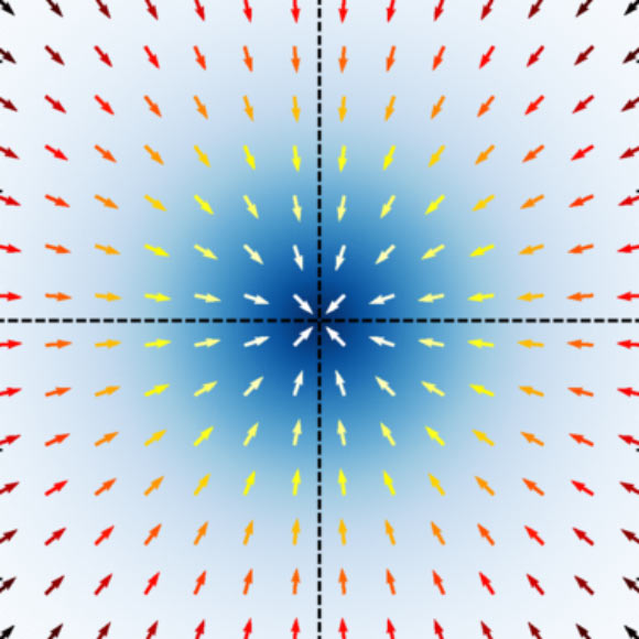 Distribution of the Colour Lorenz forces acting on the unpolarized quarks of the lateral plane (indicated by vector fields) superimposed on the upper Quark density distribution in the impact parameter space of the unpolarized protons. Image credits: Crawford et al. , doi: 10.1103/physrevlett.134.071901.