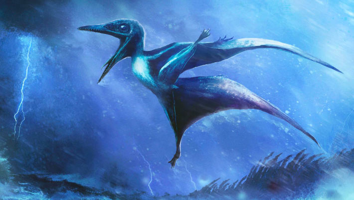 Artistic representation of the hatchling Pterodactylus antiquus, inspired by fossil discoveries, struggling through a tumultuous tropical storm. Image credit: Rudolf Hima.