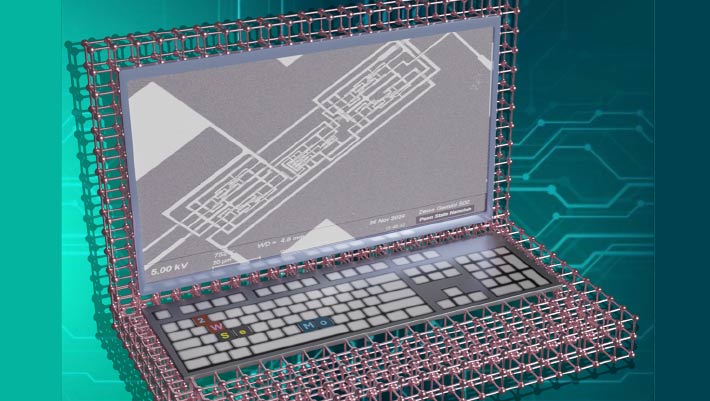 This conceptual diagram of a 2D molecule-based computer features an actual scanning electron microscope image of a computer developed by Ghosh et al. Image credit: Krishnendu Mukhopadhyay/Penn State.